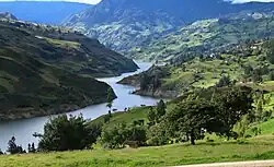The Mazar Dam is a concrete-face rock-fill dam on the Paute River Cañar Province, Ecuador. The purpose of the dam is hydroelectric power generation and it is located directly upstream of the Paute Dam as part of the Amaluza-Molino project. The dam's power station has an installed capacity of 170 megawatts (230,000 hp). Construction on the dam began in 2004; the generators were commissioned in 2010 and the remaining works were completed in 2011.[1][2][3] The power generation consists of two turbines of 90 MW, fed by a 384m power tunnel and a 60m high vertical shaft leading into the powerhouse. The powerhouse is 64 m long, 20 m wide and 39 m high, and houses two Francis-type turbines.[4]