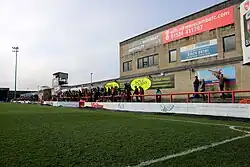 The Mazuma Mobile Stadium (formerly known as the Globe Arena for sponsorship reasons) is a football stadium in Morecambe, Lancashire, England, which is the home of Morecambe F.C.[1][2][3][4][5] The stadium opened in 2010, replacing the old Morecambe F.C. stadium, Christie Park, which was Morecambe's home from 1921 to 2010.[6] The stadium holds up to 6,476 supporters, with 2,173 seats available in the Main Stand, which runs the length of one side of the pitch.[7] Opposite the Main Stand is an uncovered terrace with a capacity of 606, giving a similar feel to the ground as that at Christie Park. At either ends of the pitch are the home and away stands, with the home end holding a maximum of 2,234 supporters and the away end having a capacity of 1,389.[8] In the north east corner of the stadium is the Tyson Fury Foundation, which is split between two floors. The building also houses a gym, which was purchased by Tyson Fury in August 2020.[9]