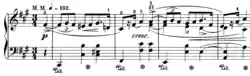 The third mazurka of the set, in E major and marked Vivace, is the only mazurka of the set in a major key and features a lively and joyful theme with accents on the third beat. The second theme alternates between chordal forte passages and lyrical ones. This quickly transitions to a third theme, which is characteristic of a kujawiak and more gentle than the previous two themes. The main theme then returns for the final time and the mazurka fades gracefully. Overall, the piece is very animated has a rhythmic drive that is quite rustic in feeling. It lasts around 2 minutes.[4]