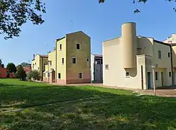 Giancarlo De Carlo was an architect who belonged to a new generation of architects who wanted to develop a new type of architecture, one which was better suited to local social and environmental conditions and where man "is not reduced to an abstract figure". He theorized a more democratic and open "participatory architecture". In 1979 he built a brightly painted housing neighbourhood to help to repopulate the island.[1]