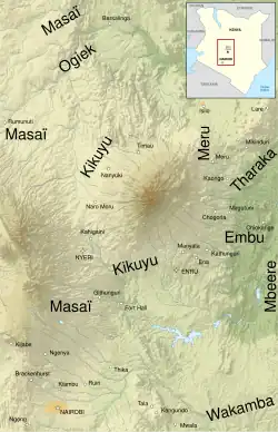 The Mbeere are of Bantu origin.[3] Like the closely related Kikuyu, Embu, Meru and Kamba, they are concentrated in the vicinity of Mount Kenya. The exact place that Mbeere's ancestors migrated from after the initial Bantu expansion from West Africa is unclear. Some authorities suggest they arrived in their present Mount Kenya homeland from earlier settlements to the north and east,[3] while others argue that the Mbeere – along with closely related Eastern Bantu peoples such as the Kikuyu, Embu, Meru and Kamba – moved into Kenya from further south.[4]