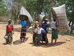 Women make winnowing baskets, small bowl baskets called vingalo for food and big bowl shaped baskets called mendeko for keeping mealie meal and other things out of the roots of mijalu trees and small roots called tujalu. Men make fishing baskets called matambi out of a species of reeds called manenga, mats out of mateve (papyrus) called manala, also manala or mats out of long grass called n'olokoko as well as mavoya and kambanga water grass.