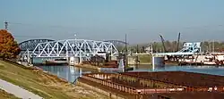 The McAlpine locks underwent a 10-year, $278 million expansion project, completed in 2009. "This work replaced the 600’ and 360’ locks with a 1200’ x 110’ lock on the Kentucky bank side of the Louisville and Portland Canal adjacent to the existing lock," according to the Corps, "for efficient movement of projected increases in tow traffic." The original bridge carrying 27th Street across the locks, built in 1926–1927, included two moveable spans – one swing span and one bascule span – but these were removed in 2007 and replaced by a new two-lane, high fixed-span concrete bridge.[4]