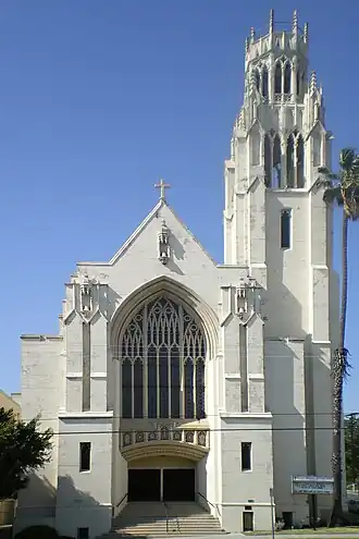 The church was built in 1932 in the English Gothic Revival style. Among the Church's notable features are stained glass windows with intricate Gothic tracery, arcaded ambulatories, and a 130-foot landmark tower with an elaborate open belfry.[2] The church was listed in the National Register of Historic Places in January 2002. Three months later, McCarty was one of 18 Los Angeles structures to be awarded a "Preserve L.A." grant from the J. Paul Getty Trust. The grant was provided to review historical documentation of the church, assess current materials and condition, and develop a maintenance plan and schedule.[2] The authors of An Architectural Guidebook to Los Angeles call McCarty an excellent example of the city's reinforced-concrete churches of the late 1920s and describe the architectural style as "Gothic, partially English, and partially French."[3]