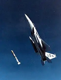 The ASM-135 missile was designed to be a standoff antisatellite (ASAT) weapon, with the F-15 acting as a first stage. The Soviet Union could correlate a U.S. rocket launch with a spy satellite loss, but an F-15 carrying an ASAT would blend in among hundreds of F-15 flights. From January 1984 to September 1986, two F-15As were used as launch platforms for the ASAT missile. The F-15As were modified to carry one ASM-135 on the centerline station with extra equipment within a special centerline pylon.[76][77] The launch aircraft executed a Mach 1.22, 3.8 g climb at 65° to release the ASAT missile at an altitude of 38,100 ft (11,600 m).[78][79] The flight computer was updated to control the zoom-climb and missile release.