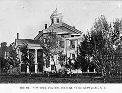 According to the New York State Department of Education, New York Central Academy, organized by citizens of McGrawville, was chartered May 4, 1864.[79]: 225 It operated from 1864 to 1867.[80]: 92 It purchased the buildings and land for $6,500 (~$103,081 in 2023) from Gerrit Smith in 1864.[79]: 220 In 1868 it became part of the McGrawville Union School, and remained in use as a high school until a new building was constructed in 1885.[80]: 55 [81]