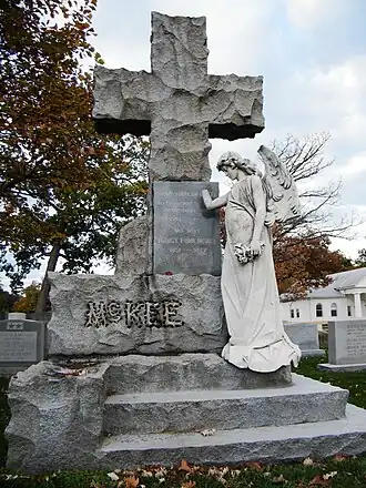 This grave marker is made of marble and has a figure of a robed angel as its centerpiece. The angel is mounted on a two-stepped base that has a large cross on the rear section of the base, behind the angel. The angel holds a bouquet of flowers in her proper left hand at waist length and her proper right arm is raised and bent upwards. She is missing her hand. The cross has a plaque that the angel stands next to. The grave is inscribed: MCKEE.[1]