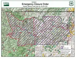 California State Route 96 was closed throughout the fire footprint.[2] Much of Klamath National Forest along the Highway 96 corridor between Yreka and Happy Camp was closed to public access by the U.S. Forest Service (USFS) between August 3 and September 6, 2021.[33] The USFS additionally closed a 110-mile-long portion of the Pacific Crest Trail, between Etna Summit in California and Mount Ashland Campground in Oregon.[34] Search and rescue teams from both Oregon and California assisted in evacuating at least 60 hikers on the PCT, who were not in immediate peril but were at risk due to the fire's rapid growth and low visibility.[35][36]