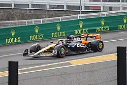 McLaren expected that the car would be uncompetitive at the Chinese Grand Prix given the quantity of low-speed corners at Shanghai International Circuit, in which the MCL38 typically underperformed (see § Assessment and characteristics).[49] In a wet sprint qualifying session, Norris qualified on pole position.[50] Piastri, who qualified eighth for the sprint, suffered an issue with his car's transmission, which malfunctioned and shifted into neutral during his qualifying lap.[51] In the sprint, Norris had a poor start and finished sixth, and Piastri finished seventh.[52][53] For the Grand Prix, Norris and Piastri qualified fourth and fifth respectively.[54] In a race twice interrupted by safety car periods, Norris moved up to finish second.[55][56] Piastri, however, was struck by Daniel Ricciardo, and finished eighth with significant damage to his diffuser.[57][58]