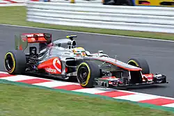 The McLaren MP4-27 is a Formula One racing car designed by Vodafone McLaren Mercedes for the 2012 Formula One season.[6] The chassis was designed by Paddy Lowe, Neil Oatley, Tim Goss, Andrew Bailey and John Iley and was powered by a customer Mercedes-Benz engine. The car was driven by former World Champions Jenson Button and Lewis Hamilton. It was launched on 1 February at the McLaren team base in Woking, Surrey, ahead of the first winter test sessions at Jerez de la Frontera.[1][7] This was the last McLaren car that Lewis Hamilton drove for the team, as he moved to the Mercedes AMG Petronas F1 Team in 2013. This was also the last McLaren Formula One car to win a race until the McLaren MCL35M did so in 2021 and the last to win more than one Grand Prix in a season until the MCL38 of 2024.