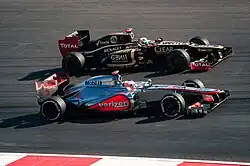 However, despite the upgrades, the cars lacked grip in qualifying due to wet weather at the German Grand Prix. Button outqualified Hamilton for the first time in 2012, in seventh while Hamilton is right behind in eighth. Both drivers were promoted to sixth and seventh respectively due to Mark Webber's gearbox change which resulted in a 5-place grid drop.[23] In the race, Button who was running second after the second pit stop, struggled to match both Alonso's and Vettel's pace due to flat spotting a tyre and was overtaken by Vettel in the penultimate lap in turn 6. However, the manner which Vettel overtook is deemed to be illegal as all 4 wheels have been out of the track to overtake. Vettel was giving a time penalty, demoting him to fifth place while Button was promoted back to an impressive send place. Hamilton's 100th F1 race was disastrous. He lost a few positions after a poor start and then suffered a puncture on Lap 3, ending his chances for a points-scoring finish. But he unlapped himself by overtaking Vettel and compromising his race. He then retired on Lap 56 after a mechanical failure in his car.[24]