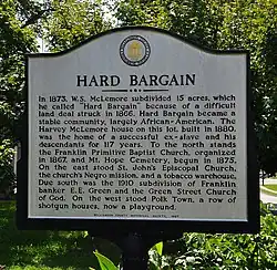 In 1880, Harvey McLemore purchased four lots from Judge McLemore. He built his house as one of the first in the subdivision. Harvey McLemore was the third African American to purchase property in Hard Bargain.[3] He and other freedmen formed a new African-American community that has survived into the 21st century.