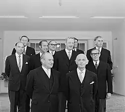 William McMahon had joined the Parliament in 1949 and by 1951 had been promoted to Minister for the Navy and for the Air. He had served as a major during the Second World War, and worked on home defence.[1] He served as Minister for Primary Industry (1956–58) and Minister for Labour and National Service (1958–66) in the Menzies government, then as Treasurer (1966–69) in the Holt government and Gorton government, and finally as Minister for External Affairs (1969–71) in the Gorton government. He was married to Sonia McMahon, who maintained a high public profile.[4]