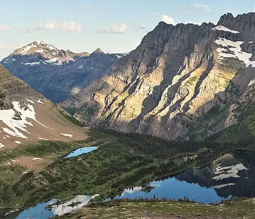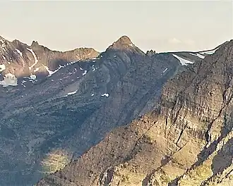 McPartland Mountain (8,417 feet (2,566 m)) is located in the Livingston Range, Glacier National Park in the U.S. state of Montana. McPartland Mountain is a little more than a mile south of Heavens Peak.[3] The mountain's name is believed to refer to Frank McPartland, of eastern Montana, who worked around nearby Lake McDonald for two seasons, and drowned in a boating accident on the lake in the 1890s.[4]