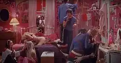 A music video for "Me & You Together Song", directed by Bedroom, was released on 6 February 2020.[61] Filmed in a retro style reminiscent of 1990s music videos, it includes homages to 1990s culture such as mix CDs, boomboxes, Converse, rooms covered in band posters, and retro T-shirts.[62][26] The music video begins with a young woman inserting a CD mixtape into her boombox before dancing on her bed. The video pivots to a house party as the song progresses, while scenes of the band performing are interspersed.[61] The bedrooms are shown to be interconnected, while at the same time the partygoers begin locking eyes with each other.[63] As the couples in the bedrooms and the party begin making out, the 1975 are shown performing in the house and the partygoers gather around them.[64] As the video concludes, the entire apartment in which the video takes place is shown to be built on a sound stage.[63]