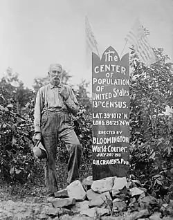 Map showing changes to the mean center of population for the United States, 1790–2020 (US Census Bureau)[1]Map of the Position of the U.S. Geographic Center of Area, Mean Center of Population, and Median Center of Population, 2020 (U.S. Census Bureau)[2]The center of the US population, 13th census (1910), near Bloomington, IndianaThe center of the US population, 13th census (1910), near Bloomington, Indiana