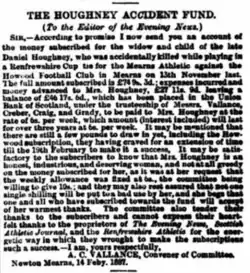 An accident fund raised £75[13] for Mr Houghney's widow and child.[14] Houghney was 27 years old.