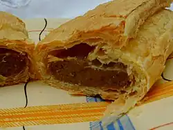 A meat-free sausage roll (also known as a vegetarian sausage roll or vegan sausage roll) is a savoury pastry snack that contains a non-meat filling. The snack is an alternative to the conventional sausage roll that generally contains pork or beef. Meat-free sausage rolls are sold at retail outlets and are also available from bakeries as a take-away food.