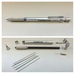 A mechanical pencil or clutch pencil is a pencil with a replaceable and mechanically extendable solid pigment core called a "lead" /ˈlɛd/. The lead, often made of graphite, is not bonded to the outer casing, and the user can mechanically extend it as its point is worn away from use. The vast majority of mechanical pencils have erasers.