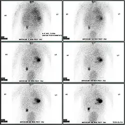 A technetium-99m (99mTc) pertechnetate scan, also called Meckel scan or nuclear scintigraphy scan, is the investigation of choice to diagnose Meckel's diverticula in children. This scan detects gastric mucosa; since approximately 50% of symptomatic Meckel's diverticula have ectopic gastric or pancreatic cells contained within them,[24] this is displayed as a spot on the scan distant from the stomach itself. In children, this scan is highly accurate and noninvasive, with 95% specificity and 85% sensitivity;[17] however, in adults the test is only 9% specific and 62% sensitive.[25] This scan is more accurate in children because gastric mucosa is found in 90% of bleeding diverticula; which is the most common symptom in children, not adults. [26]