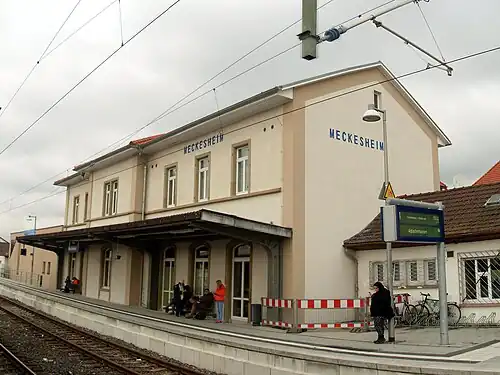 Meckesheim station is a small railway junction in Meckesheim, North Baden in the German state of Baden-Württemberg. It is located on the Neckargemünd–Bad Friedrichshall railway and is classified by Deutsche Bahn as a category 4 station.[1] The Schwarzbach Valley Railway branches off the Elsenz Valley Railway to Aglasterhausen in Meckesheim. Until 1990, the Wiesloch–Meckesheim/Waldangelloch railway also branched off via Schatthausen to Wiesloch Stadt and Wiesloch-Walldorf.