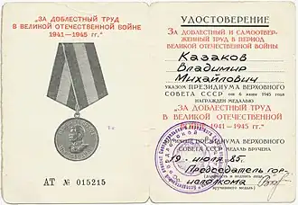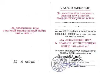 The Medal "For Valiant Labour in the Great Patriotic War 1941–1945" (Russian: медаль «За доблестный труд в Великой Отечественной войне 1941–1945 гг.») was a World War II civilian labour award of the Soviet Union established on June 6, 1945 by decree of the Presidium of the Supreme Soviet of the USSR[1] to recognise the valiant and selfless labour of Soviet citizens in the Soviet Union's victory over Nazi Germany in the Great Patriotic War. Its statute was later amended by decree of the Presidium of the Supreme Soviet of the USSR on July 18, 1980.[2]