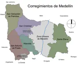 Medellín has 16 comunas (districts), 5 corregimientos (townships), and 271 barrios (neighborhoods). The metropolitan area of Medellín lies within the Aburrá valley at an elevation of 1,500 meters (4,900 feet) above sea level and is bisected by the Medellín River (also called Porce), which flows northward. North of the valley are the towns of Bello, Copacabana, Girardota, and Barbosa. To the south of the valley lie Itagüí, Envigado, Sabaneta, La Estrella, and Caldas.