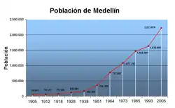 In 1951 the city had 358,189 inhabitants, but 22 years later, in 1973, the population had tripled to 1,071,252.[24] The population explosion had several consequences for the MMP. The urban limits of the city grew to areas that were not contemplated in the MMP, so that Medellín now reached the urban areas of other cities of the Aburrá Valley, like Envigado, Bello and Itagüí; the new Medellín settlers were poor families without enough credit to buy their own homes, so several neighborhoods were built beyond the MMP; several old downtown buildings were demolished to construct tall towers, offices, and avenues.