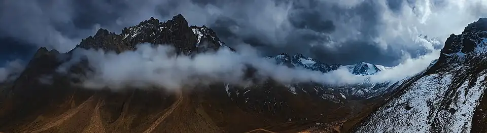 The Medeu gorge (Kazakh: Медеу трактаты, romanized: Medeu traktaty; Russian: урочище Медеу, romanized: urochishche Medeu) is a territory located in the valley of Malaya Almatinka River, in foothills of Trans-Ili Alatau ridge at an altitude of 1520–1750 meters, 14 km to the southeast of center of Almaty. The natural boundaries of gorge territory are: Kimasar mountain spur separating the basins of the Malaya Almatinka and Butakovka rivers, to the east - Kabyrgatau separating the gorges of the Kimasar and Sarysai rivers, to the south-west - Kumbel peak. On territory of the gorge in 1966 a mudflow protection Medeu Dam was built, below which is located the Medeu high-mountain sports complex. The Medeo hotel was formerly located near the Medeu rink, until it was demolished in the early 2000s.[1]