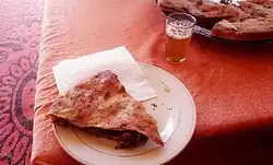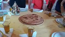 ![]() Medfouna or Berber pizza at a local restaurant near Merzouga, Errachidia Province. | |