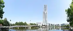 The MediaPark is an urban regeneration neighborhood in Cologne, Germany, completed by the turn of the millennium. It was set up to accommodate companies of the media and communication industry, as well as cultural institutions, a hotel and some apartment buildings. The MediaPark is situated in Neustadt-Nord, Cologne, on the site of a former goods station, and is some 20 hectare large. The project was designed by Canadian architect Eberhard Zeidler, with construction lasting from 1990 until 2004. The buildings sit radially around a central square, and are surrounded by parks and a small lake. The city quarter's focal point is the 148 metre tall KölnTurm, designed by French architect Jean Nouvel and completed in 2001.