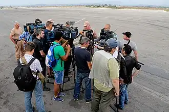 Except for those selected by the Syrian government, journalists have been banned from reporting in Syria. Those who have entered the country regardless have been targeted. Within a month of the protests taking off, at least seven local and international journalists were detained, and at least one of them was beaten.[32] 'Citizen journalist' Mohammed Abdelmawla al-Hariri was arrested in April 2012, tortured in prison, and sentenced to death in May 2012 for giving an interview for Al Jazeera.[33] Jordanian Salameh Kaileh was tortured and detained in deplorable conditions before being deported.[34]