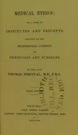Medical Ethics; or, a Code of Institutes and Precepts, Adapted to the Professional Conduct of Physicians and Surgeons is a medical book focused on public health and medical ethics. It was written by English physician Thomas Percival and published in 1803. The book is widely regarded as the first on public health and ethics in medicine.[1] Prior to 1803 medical ethics was more focused on medical etiquette. Medical Ethics was the first book to coin the term "medical ethics". The book "adopts a holistic approach to patient care"[2] and set the standard for many future textbooks.[3]