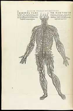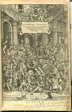 He wrote around 14 books on his findings in anatomy, including his best known book De humani corporis fabrica.[11] It was revolutionary because of the accuracy and precision of his descriptions and images of organs and would refute Galen's belief that human anatomy is closely related to apes.[14] The book was a dedication to Charles V, Holy Roman Emperor. Vesalius published De humani corporis fabrica at the age of 28.[14] With him being so young, it made his contributions harder to accept. De Fabrica was a milestone in medical science as it detailed many aspects of the human cadaver as well as presenting it in the form of art. Its imagery drew on new Renaissance methods in art. An example of his work is a picture of a dissected corpse hung by a rope through its eye sockets with the upper diaphragm on a wall behind the corpse.[14] The book gave clear identification of the organs in the human body while also removing the aspects that he found flawed with Galen's teachings.