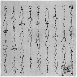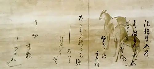 Works discussing the rejection of the material world, beginning with Saigyō at the end of the previous era, continued to be composed in the Kamakura period.[9] These works combined poetry describing the recluse life in thatched-hut retreats with magnificent essays called zuihitsu.[9] The most important examples are Kamo no Chōmei's Hōjōki and Kenkō's Tsurezuregusa which were written around the very end of the Kamakura period and the beginning of the Nanbokuchō period.[9] The former describes its author's journey toward giving up the world, social changes, and celebrates recluse life, while the latter is a work of instruction detailing its author's inner thoughts and feelings as he lives in quiet seclusion.[9] Along with the classical Pillow Book, they are considered the archetypal Japanese zuihitsu.[9]