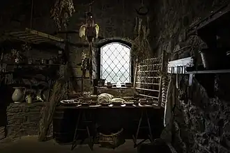 The calorie content and structure of medieval diet varied over time, from region to region, and between classes. However, for most people, the diet tended to be high-carbohydrate, with most of the budget spent on, and the majority of calories provided by, cereals and alcohol (such as beer). Even though meat was highly valued by all, lower classes often could not afford it, nor were they allowed by the church to consume it every day. In England in the 13th century, meat contributed a negligible portion of calories to a typical harvest worker's diet; however, its share increased after the Black Death and, by the 15th century, it provided about 20% of the total.[21] Even among the lay nobility of medieval England, grain provided 65–70% of calories in the early 14th century,[22] though a generous provision of meat and fish was included, and their consumption of meat increased in the aftermath of the Black Death as well. In one early-15th-century English aristocratic household for which detailed records are available (that of the Earl of Warwick), gentle members of the household received a staggering 3.8 pounds (1.7 kg) of assorted meats in a typical meat meal in the autumn and 2.4 pounds (1.1 kg) in the winter, in addition to 0.9 pounds (0.41 kg) of bread and 1⁄4 imperial gallon (1.1 L; 0.30 US gal) of beer or possibly wine (and there would have been two meat meals per day, five days a week, except during Lent). In the household of Henry Stafford in 1469, gentle members received 2.1 pounds (0.95 kg) of meat per meal, and all others received 1.04 pounds (0.47 kg), and everyone was given 0.4 pounds (0.18 kg) of bread and 1⁄4 imperial gallon (1.1 L; 0.30 US gal) of alcohol.[23] On top of these quantities, some members of these households (usually, a minority) ate breakfast, which would not include any meat, but would probably include another 1⁄4 imperial gallon (1.1 L; 0.30 US gal) of beer; and uncertain quantities of bread and ale could have been consumed in between meals.[24] The diet of the lord of the household differed somewhat from this structure, including less red meat, more high-quality wild game, fresh fish, fruit, and wine.[25]