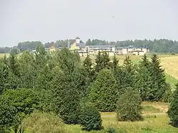 In line with general political and economic change the "Red Banner" kolkhoz was disbanded, and its estates and properties were divided among local coopratives, enterprises and private individuals; some plots expropriated half a century earlier returned to heirs of the original owners.[139] Nearby border crossing at the key highway between Vilnius and Minsk triggered emergence of business from logistics and transport sectors.[140] In the early 1990s a member of the Polish branch of the Franciscan order settled in Medininkai; few others followed.[141] In 1994 a small Franciscan monastery was set up in the village, the first one after the Augustians had been evicted 163 years earlier. Very briefly the monastery consisted also of a postulate and a novitiate,[142] moved to Vilnius by the end of the decade.[143]