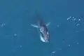 The fin whale (Balaenoptera physalus) is the only baleen whale species with a significant resident population in the Mediterranean, mainly located in the northern half of the western basin, between Spain, France and Italy.[16] It is the second largest animal on our planet after the Blue whale (B. musculus), reaching 22 m in length and weighing 70 tonnes.[2] In the Mediterranean, it feeds almost exclusively on Meganyctiphanes norvegica, the Mediterranean krill.[2]