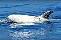 Blainville's Mesoplodon (Mesoplodon densirostris) is a beaked whale that is smaller (4–6 m)[47] than the previous species, with a longer beak[48] and deformed tusks in both sexes. This species has been recorded in the Mediterranean, but its presence is very rare, even uncertain.[12][13][14][17]
