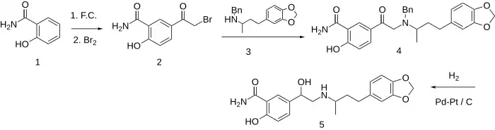 For the first step, salicylamide (1) is the subject of a Friedel-Crafts acetylation and then the aromatic methyl ketone is halogenated. in the usual manner. The bromide in 2 is then displaced by the nitrogen in N-benzyl-1-(3',4'-methylenedioxyphenyl)-3-butylamine (3), which is itself prepared by reductive amination on the corresponding ketone. The product of the last step (4) is catalytically hydrogenated. This serves the dual purpose both of reducing the ketone and removing the benzyl protecting group affording the product medroxalol (5). Note that a benzyl protecting group is not necessarily used.