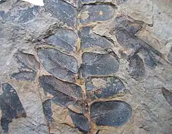 Fragments of the fronds are the most frequently found fossils of the Medullosales, and they have been widely used for biostratigraphy[19] and biogeographical studies.[20] Most are characterised by a major fork of the main rachis in the lower (proximal) part of the frond. Each branch produced by the fork has an essentially pinnate appearance, superficially resembling the fronds of many ferns, but it is now thought that they in fact consist of a series of more or less overtopped dichotomies.[21] Only one group of fronds, known as parispermacean fronds (fossil genera Paripteris and Linopteris), lacked this major dichotomy although they were still thought to have been constructed from a series of overtopped dichotomies.[22]