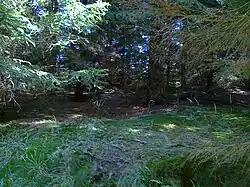 The summit and its slopes are located southwest of the European watershed boundary, thus belonging to the Black Sea basin. Waters from this part of the Hrubý Jeseník mountains flow into the Danube river basin, which is an extension of the rivers and mountain streams originating here, including the Divoká Desná river and streams such as Borový potok and Tříramenný potok. From the northwestern and northern slopes, several short, unnamed streams originate, feeding into the Divoká Desná river.[3] Approximately 920 m west of the summit, on the Borový potok stream, at an elevation of about 810 m, there is a waterfall named Vodopád na Borovém potoce with a total height of 14 m.[16][17] Access to it is from the blue tourist trail running from the Pod Medvědí horou tourist intersection. Additionally, at the foot of the northwest slope, close to the flowing Divoká Desná river, there are two oval connected water reservoirs, measuring 40 m and 95 m in length.[3][18]