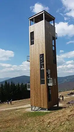 The tower is located about 550 metres southwest of the peak, at an altitude of 1,095 metres above sea level, and approximately 50 metres from the upper chairlift station.[3] It was built between June and October 2014 and opened on 23 October.[12] The tower has a cuboid shape with dimensions 4.1 × 4.1 × 18 metres and features a steel skeleton structure with internal circular stairs around the walls, mounted on a concrete foundation.[13] It is clad in vertical wooden slats and has window openings and viewing balconies situated at different heights on some walls, along with a main platform under the roof. The tower may be closed in adverse weather conditions such as icing or storms. Access to the tower is via the chairlift from the settlement of Kouty nad Desnou.[3] The tower offers panoramic views from the west to the north, including the area of some peaks of the Keprník Mountains. A fast food outlet Bar u Medvěda in the form of a rotunda is located on the platform near the tower. The total cost of the tower and nearby facilities and their connections was approximately 8,300,000 CZK (including about 2,800,000 CZK for the tower).[13]