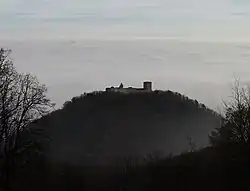 Medvedgrad (pronounced [mědʋedɡraːd]; Croatian for bear-town; Hungarian: Medvevár) is a medieval fortified town located about 10 km north of Zagreb, on the south slopes of Medvednica mountain, approximately halfway from the Croatian capital Zagreb to the mountain top Sljeme. For defensive purposes it was built on a hill, Mali Plazur, that is a spur of the main ridge of the mountain that overlooks the city. On a clear day the castle can be seen from far away, especially the high main tower. Below the main tower of the castle is Oltar Domovine (Altar of the homeland) which is dedicated to Croatian soldiers killed in the Croatian War of Independence.[1][2] The altar of the homeland, made by the sculptor Kuzma Kovačić, was opened by Croatian President Dr. Franjo Tuđman, May 30, 1994.[3]