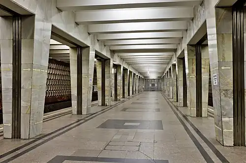 The architects Nina Aleshina and Natalya Samoilova designed Medvedkovo station. It features flared pillars faced with pinkish marble and strips of stainless steel. The outer walls of the station are coated with red marble and interlocking triangles of anodized aluminum punctuated with plaques by M. Alekseev depicting northern wildlife.