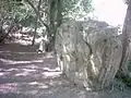The Upper White Horse Stone is located inside a narrow strip of woodland east of the A229 dual carriageway, and can be reached via the Pilgrim's Way track.[106] Erected in an upright position, the stone measures 2.90m in length, 1.65m in height, and 60 cm in width.[106] There are nine smaller stones extending westward from the Upper White Horse Stone for about 10 metres.[106] These might represent parts of a chambered tomb, although there is no evidence of a mound, and it is possible that they are actually stones moved from an adjacent field by farmers.[125] About 300m west of the Upper White Horse Stone was a second large upright stone, known as Lower White Horse Stone, but this was destroyed in the 1820s, and its site is probably now under the dual-carriageway.[126]