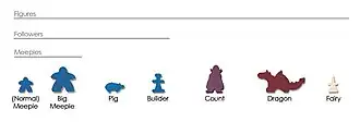 Some companies offer hand-painted, deluxe meeples, and meeples in some games are customized in various ways; for example, Tiny Epic Quest has customizable meeples that can hold various items such as weapons.[7] Some games, including expansions to Carcassonne, have wooden figurines shaped in non-humanoid forms that are sometimes called meeples; for example, Dixit has rabbit-shaped meeples.[5] Farm animal meeples are sometimes called "sheeples", monsters "creeples", and robots "bleeples".[5] The term meeple has occasionally been used for wooden board game pieces representing inanimate objects like vehicles.[8] More elaborate miniatures used in gaming, such as the ones used in miniature wargaming, are not usually called meeples.[8]