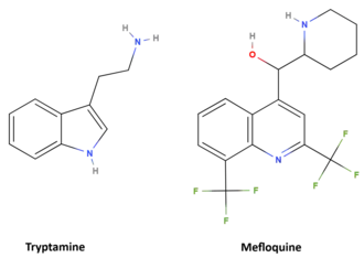 The chemical structure of mefloquine is similar to that of tryptamine and its derivatives.[39] However, whereas tryptamine is an indolylethylamine, mefloquine is a quinolinylethylamine.[39] Mefloquine's structure is also particularly similar to that of 10,11-secoergoline (α,N-tetramethylenetryptamine).[39]