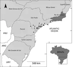 A species endemic to Brazil, Megalobulimus dryades primarily inhabits the middle and lower Ribeira de Iguape River basin in southern São Paulo state and northeastern Paraná state in the Atlantic Forest biome. It is known to occur in protected areas such as the Alto Ribeira Tourist State Park, and the Intervales State Park.[2] It exhibits a high environmental tolerance, which may have facilitated its spread.[2] Notably, its shells have been utilized in local handicrafts, potentially contributing to its distribution. There are also records of its presence in western Santa Catarina state, previously misidentified as M. gummatus.[2][11]