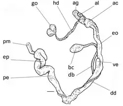 The reproductive system is hermaphroditic, meaning each individual has both male and female reproductive organs. The female portion includes an albumen gland, uterus, and a bursa copulatrix (a sac involved in sperm storage). The male portion includes a long, cylindrical penis that is coiled by the vas deferens. Inside the penis are simple longitudinal folds and a small transverse fold near the tip. The epiphallus, a structure connecting the penis to the vas deferens, is short and broad and bears two slender, whip-like extensions called flagella.[2]